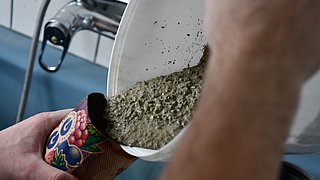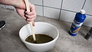 Anschließend mischt man Wasser mit dem Beton im Verhältnis 1:2 (Wasser:Beton) in einem kleinen Eimer zu einer dickflüssigen Masse. Die fertig angemischte Masse wird langsam in den vorbereiteten Behälter gegossen. Achten Sie darauf, etwas Freiraum zu lassen, damit der Beton beim Formen des Hohlraums nicht überläuft.