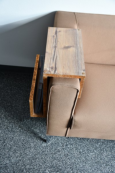 Der Couchtisch aus Holz bietet nicht nur ein hohes Maß an Komfort, er verleiht Ihrem Wohnzimmer auch einen rustikalen Look und ist einfach selbst gebaut. Die Ablage kann einfach über die Armlehne der Couch gelegt werden und bietet sicheren Halt, um das Handy abzulegen oder ein Glas darauf abzustellen, und ein Seitenfach für Zeitschriften oder das Tablet.