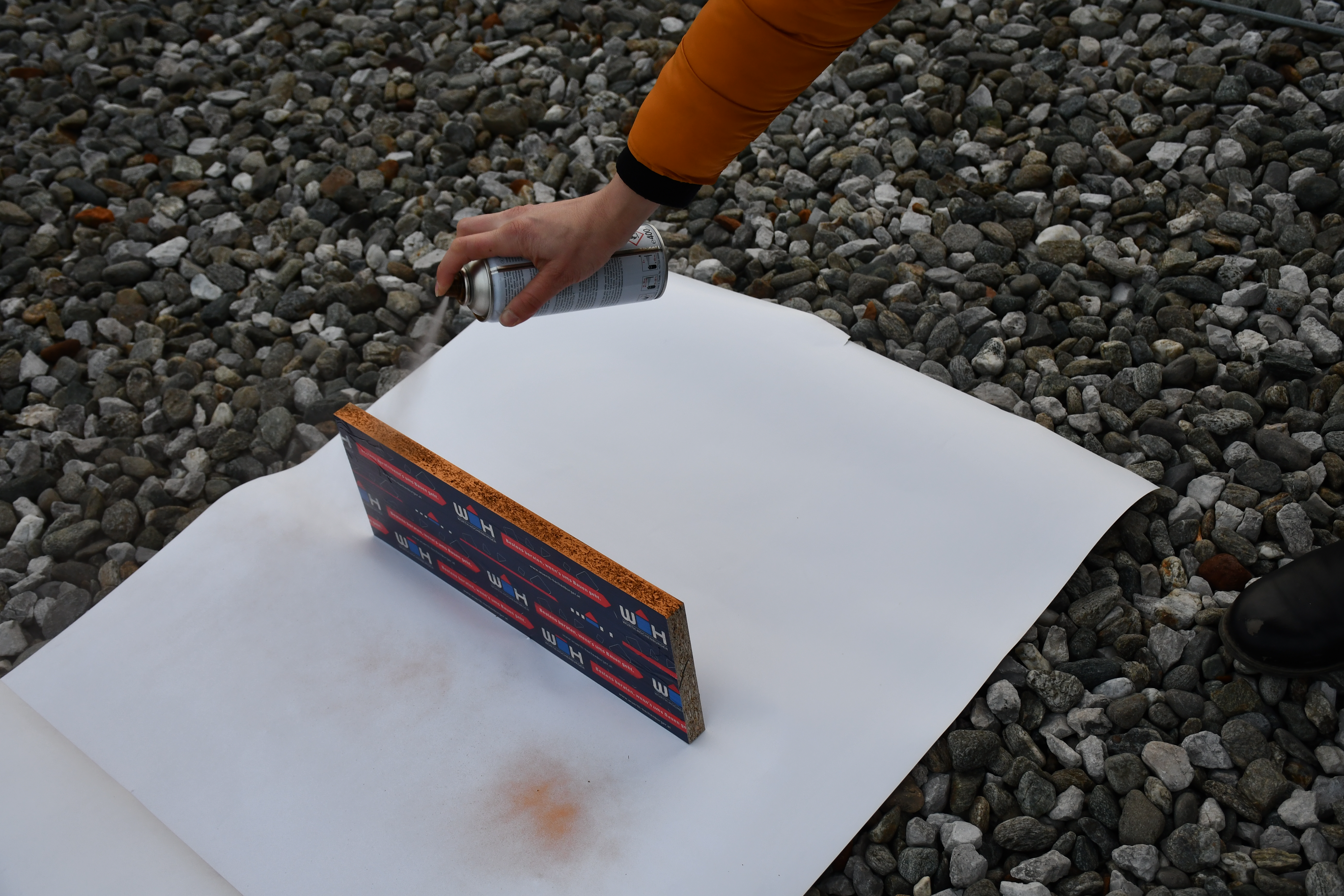Als erstes werden die Flächen abgeklebt, um dann die sichtbaren Kanten mit einem Lack zu besprühen. Diese sollte man ein paar Stunden trocknen lassen.