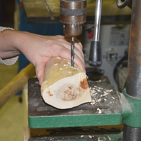 Abgelagertes Rundholz zuschneiden und Bohrlöcher in unterschiedlichen Größen ins Längsholz setzen. Mit Schleifpapier sorgfältig abschmirgeln.