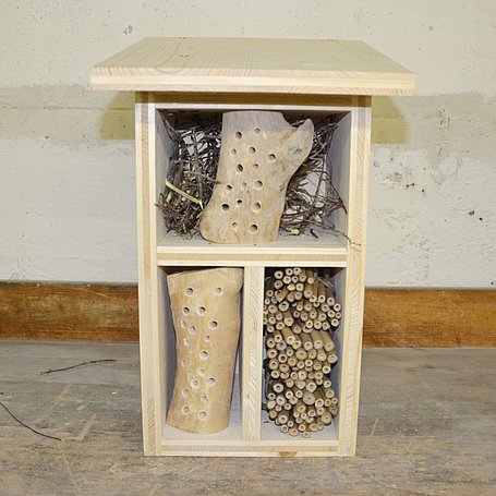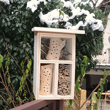 Das fertige Insektenhotel erhöht und an einem sonnigen Platz aufstellen.