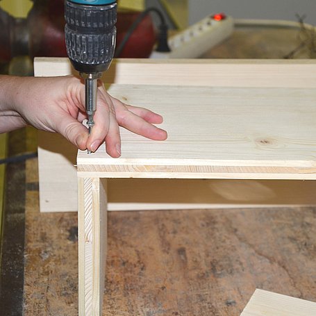 Seitenwände vorbohren, um ein Splittern und Spleißen des Holzes zu verhindern, und anschließend zusammenschrauben.