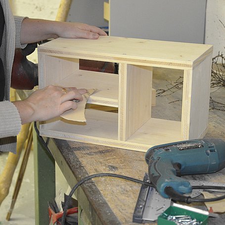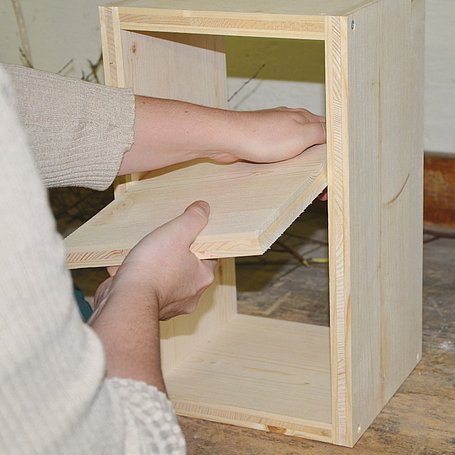 Zwischenwände nach Belieben einziehen und von Außen anschrauben. Rückwand anschrauben.