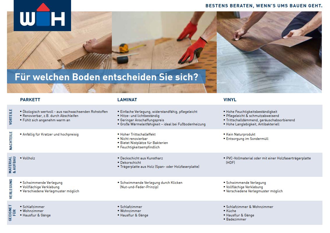 WH macht für Sie den großen Vergleich: Parkett vs. Laminat vs. Vinyl. Vor- und Nachteile sowie alle wichtigen Infos rund um Material, Verlegen und Einsatzbereiche finden Sie auf einen Blick in unserer praktischen Tabelle. Gerne hilft Ihnen auch unser Fachpersonal vor Ort in den Holz-Abteilungen unserer Baumärkte weiter.