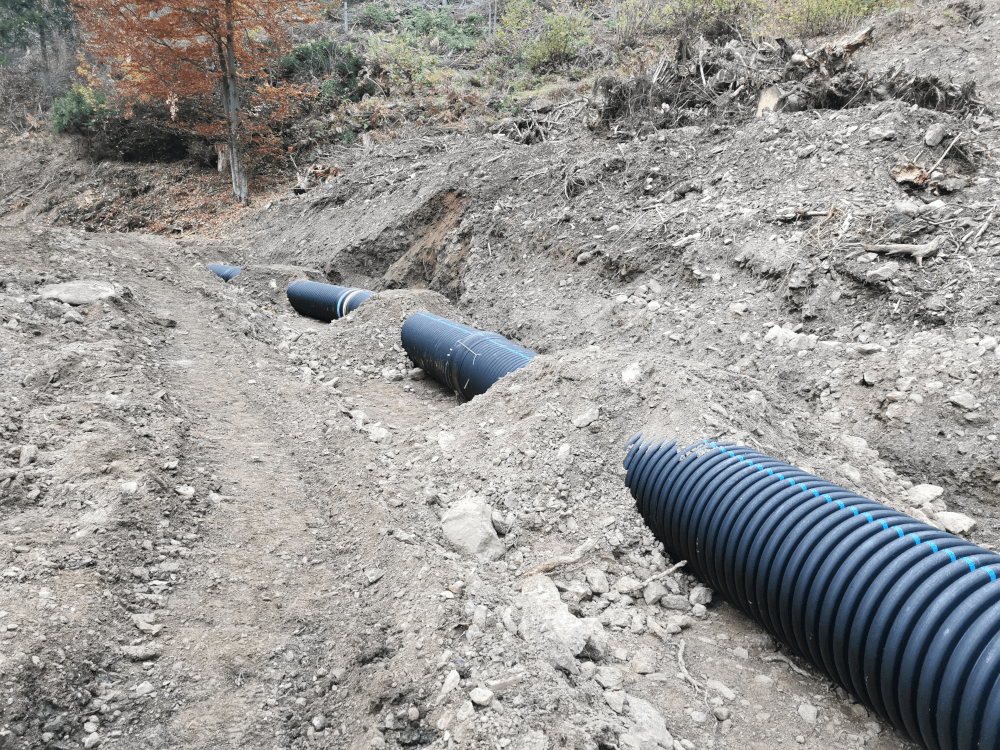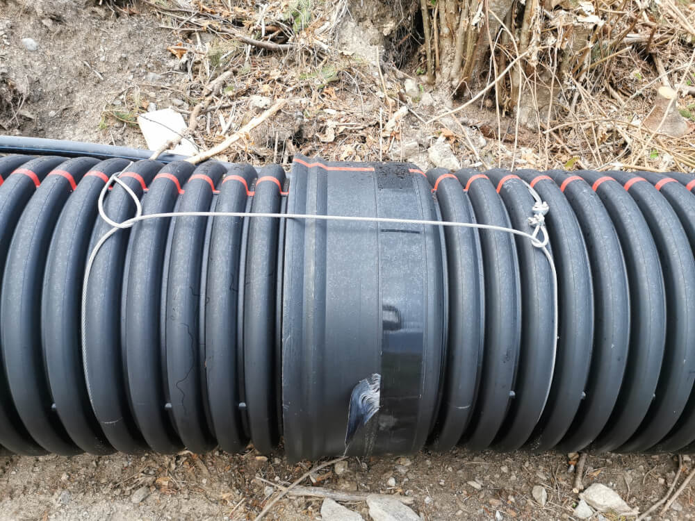 Zur Teilausführung kam im Bauberichtsjahr 2020 eine Verrohrung ausgehend vom Großbach bis hin zum Grafenbach. Die Gesamtläge der Verrohrung beträgt rund 1.000m. Das Pauschalgefälle weist zwischen 2% und 5 % Neigung auf, welches bei einem Rohrdurchmesser von 600 mm nicht unterschritten werden darf, um den erforderlichen Spitzenabfluss abführen zu können.
