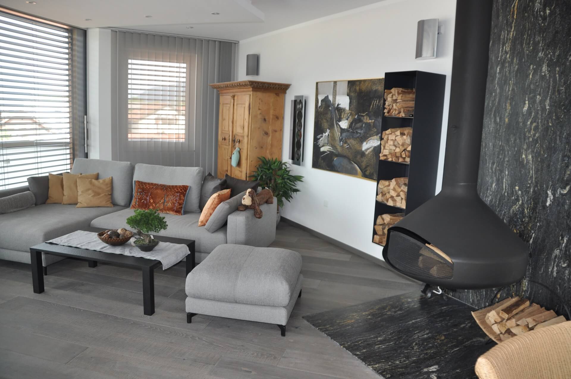Die Einrichtung der Wohnräume spiegelt die Liebe zum Detail wider. Elegantes, nordisches Design in den dezenten Farbtönen und großflächige Schwarz-Weiß Fotos mit Ansichten aus Zirl und der umliegenden Bergwelt sowie eine atemberaubende Aussicht dominieren den Raum. Die WH-Elementeabteilung unter der Leitung von Wolfgang Plattner lieferte für dieses Bauprojekt in Spezialausfertigung sämtliche Innentüren sowie die Eingangstür und hochwertige Fenster.