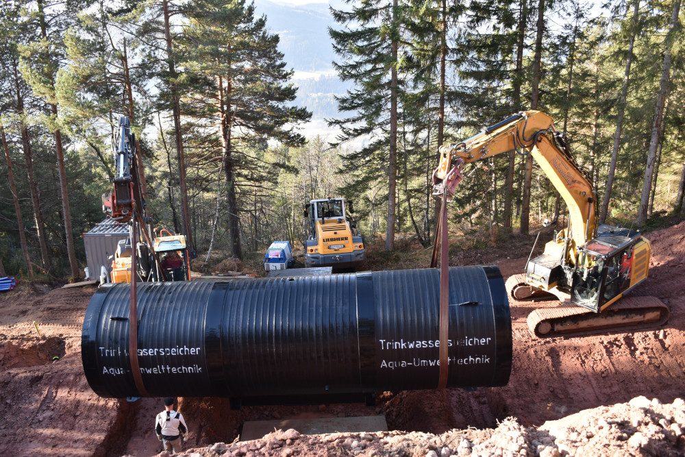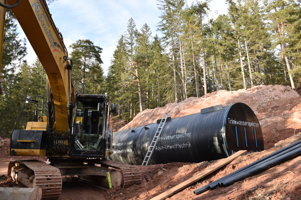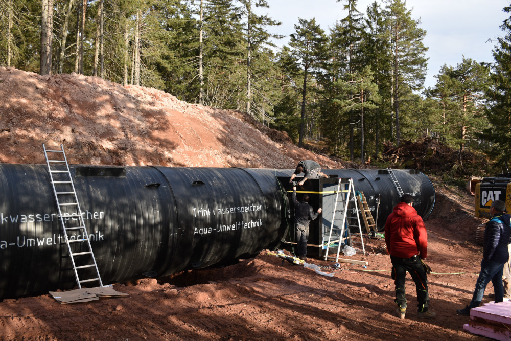 Der Hochbehälter besteht aus zwei Wasserkammern zu je 50.000 l und wurde aus dem Werkstoff Polyethylen durch die Firma Aqua Umwelttechnik hergestellt.